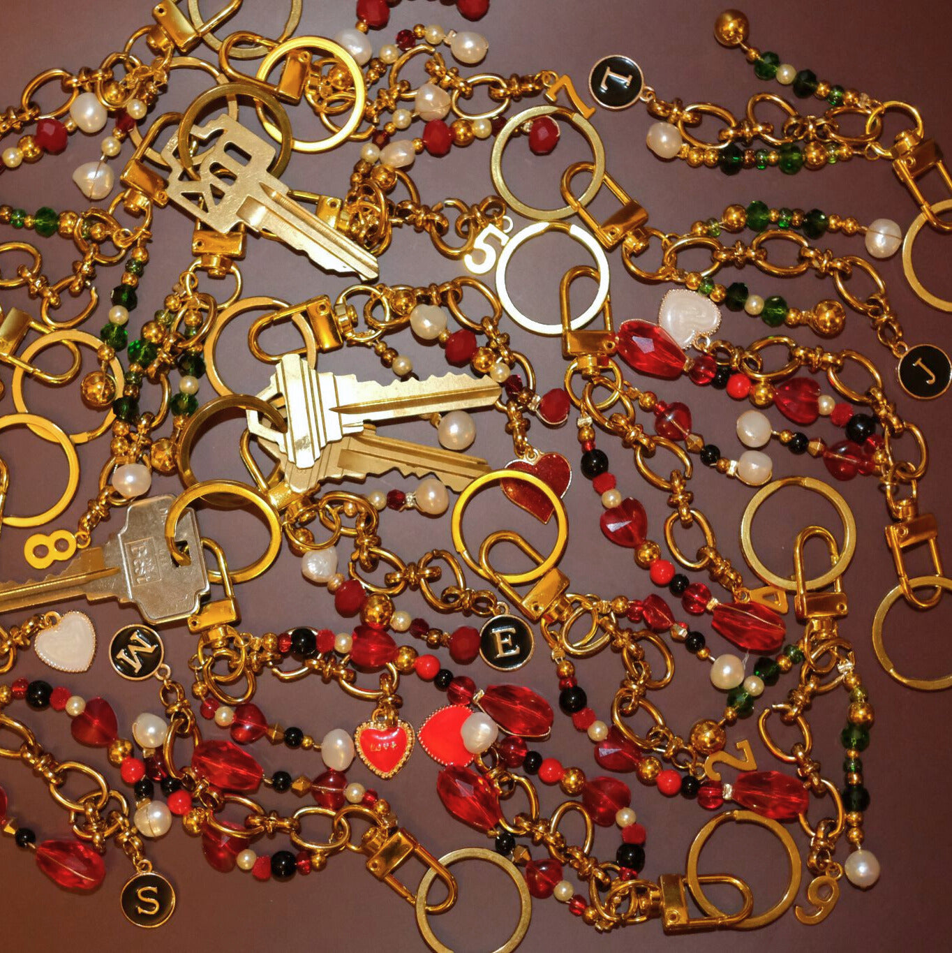 A timeless accent with depth and warmth. This handcrafted bag charm features a deep red palette paired with pearl accents and polished gold hardware. Designed to clip onto handbags, weekenders, or keys, it adds a refined pop of color while remaining elegant and understated.
